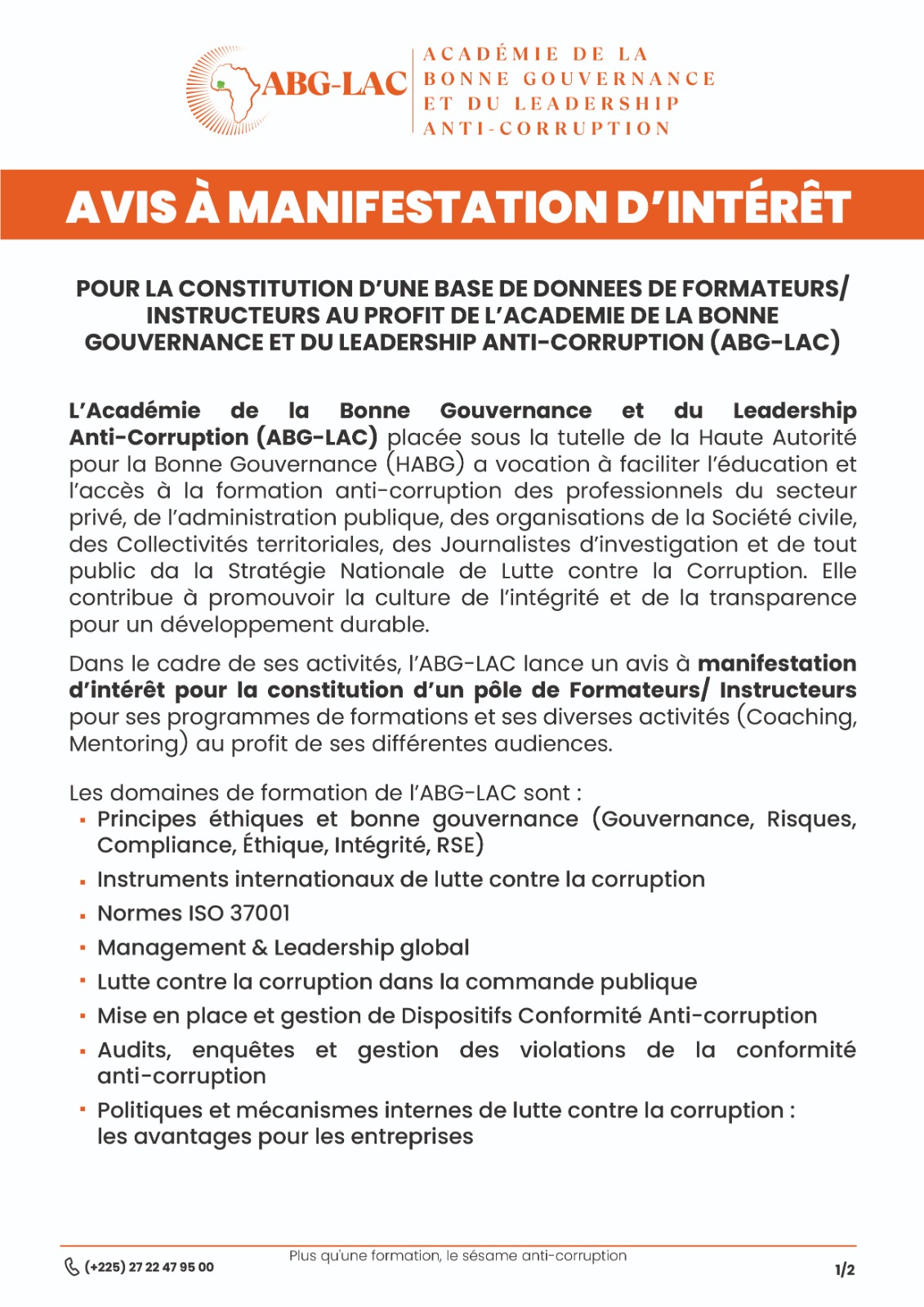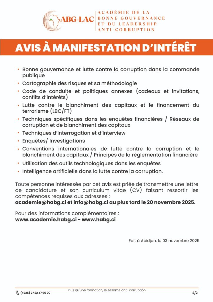 L’Académie de la Bonne Gouvernance et du Leadership Anti-Corruption (ABG-LAC), placée sous la tutelle de la Haute Autorité pour la Bonne Gouvernance (HABG), lance un appel à manifestation d’intérêt pour la constitution d’une base de données de formateurs et d’instructeurs dans les domaines de la bonne gouvernance, de l’éthique, du leadership et de la lutte contre la corruption.